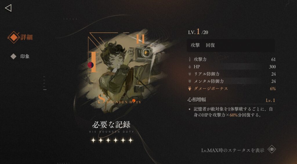 記憶者が敵対象を1体撃破するごとに、自分のHPを攻撃力×60%分回復する。