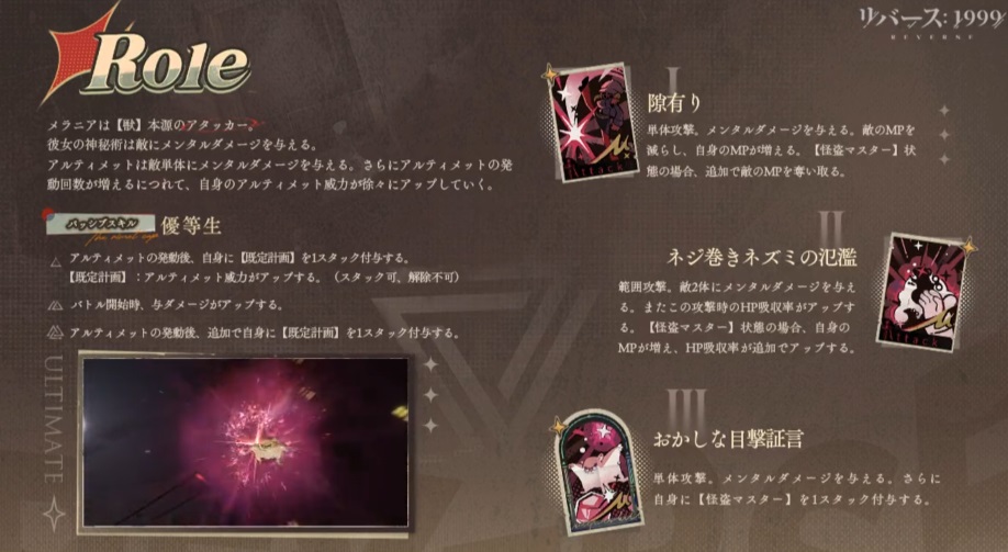 単体攻撃。メンタルダメージを与える。その後の2ラウンドの間、味方全体の与ダメージ+30%。【話題解明】状態の場合、この与ダメージバフの持続時間+1ターン。