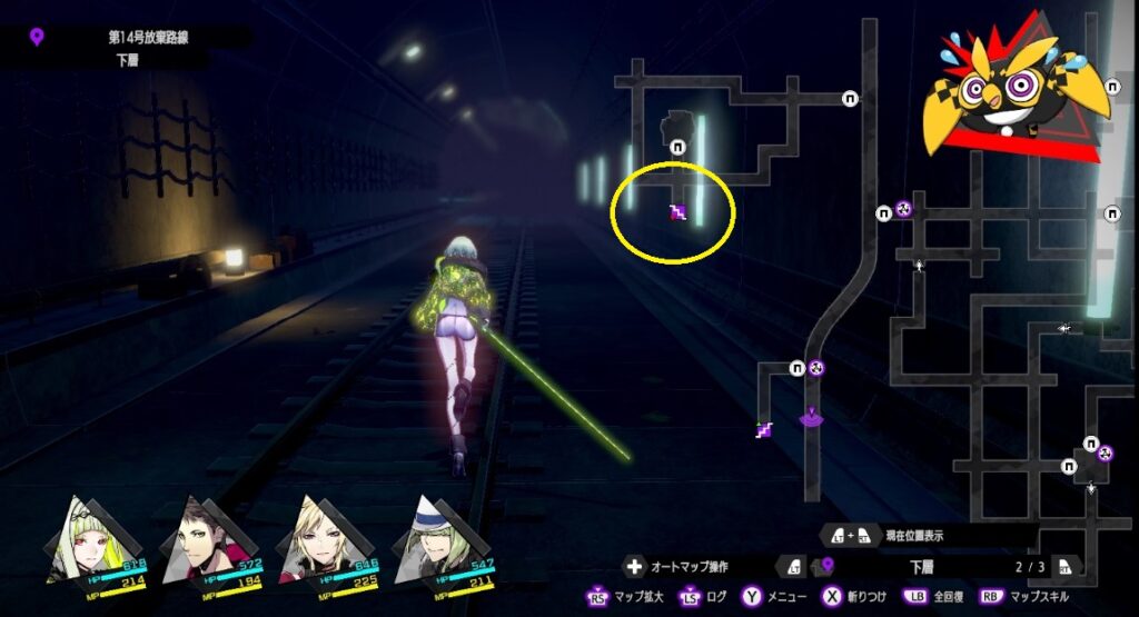山羊の頭の悪魔を倒すと結界がなくなり、下層の線路側が探索できるようになる。まずは、左上へ向かい階段から最下層へ降りてアイテムを回収する。