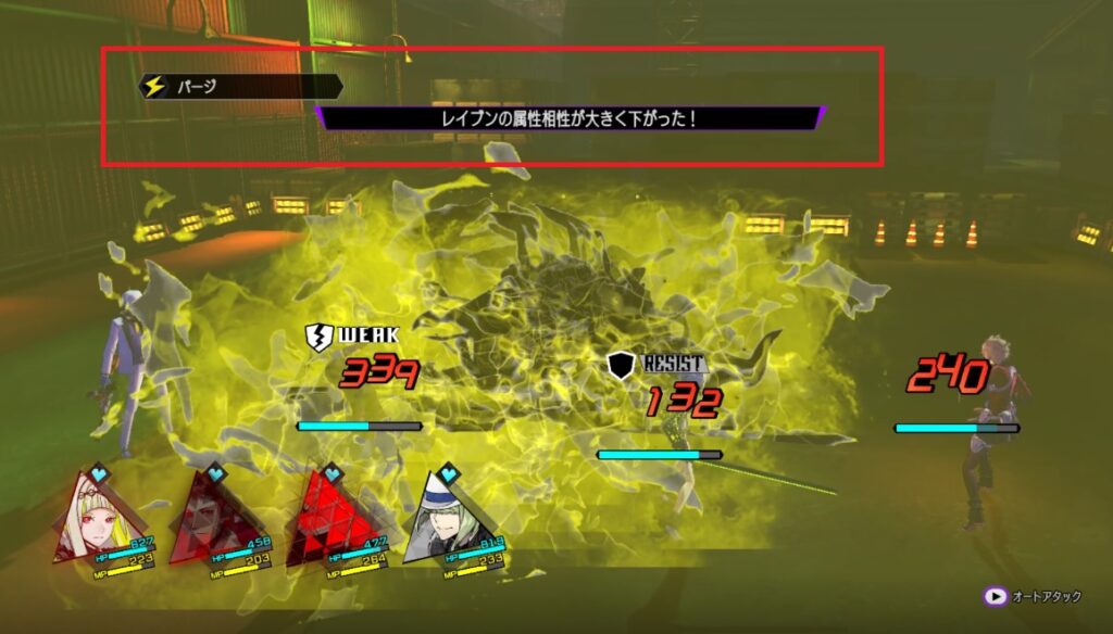 その後はパージを2回連続で使ってきますが、そこまで大きなダメージではないので「メ・ディアラマ」で回復しつつ弱点属性を突いていけば倒せるかと思います。