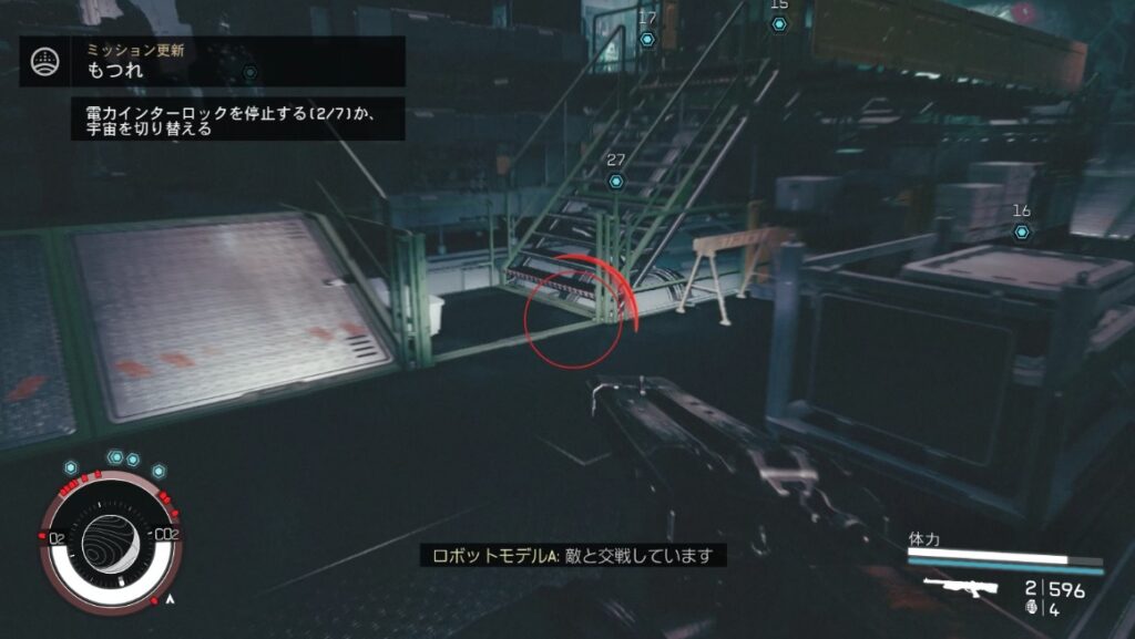 正面に見える扉をカードキーで開け道なりに進み、部屋の中にある歪みを調べ廃墟へ。ロボットとタレットが攻撃してくるので適宜倒してください。