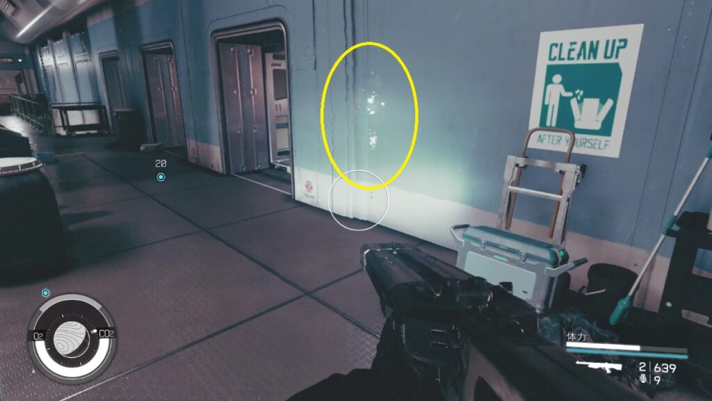 - 上階にある歪みを調べて廃墟へ(CLEAN UPのポスター横)