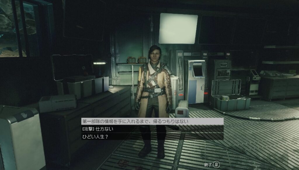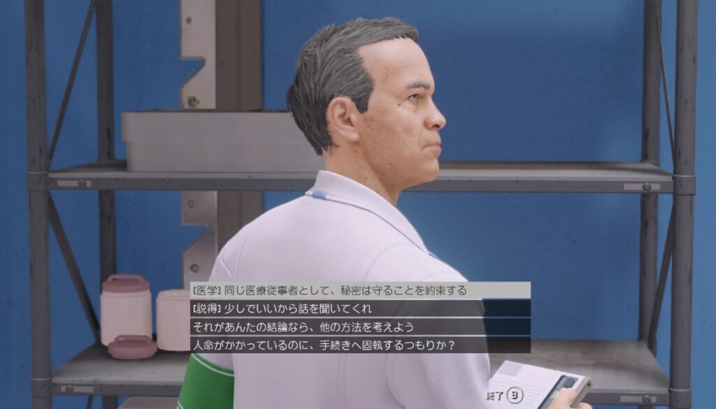 ロボットが襲ってくるエリアを抜けた後に建物内でマヤと会話。最後の選択肢で殺すか否かの選択となる。