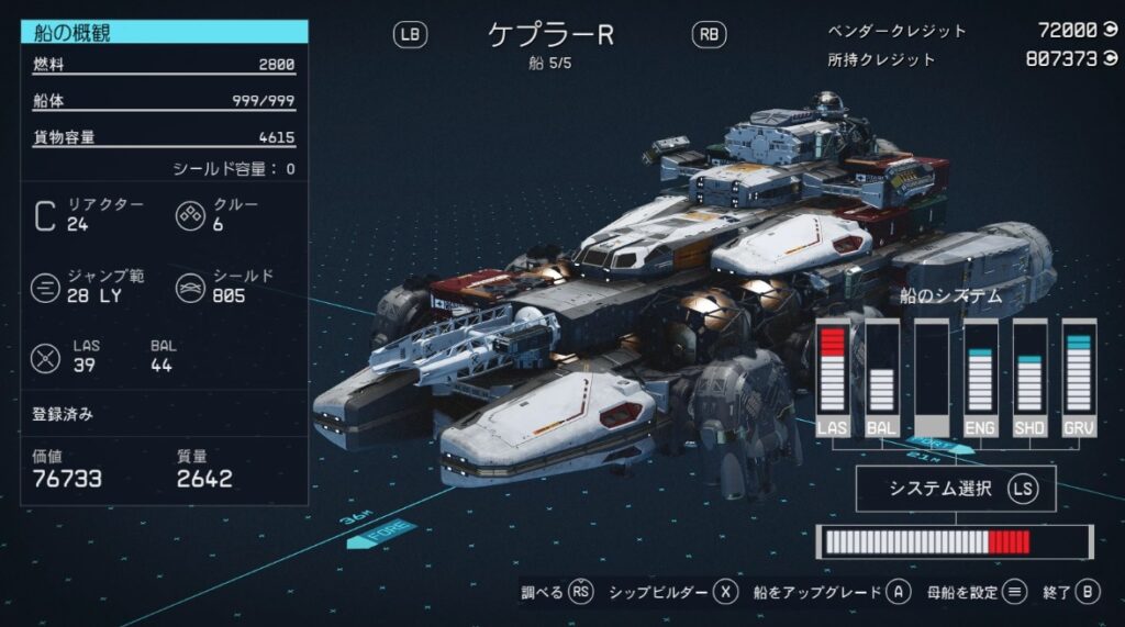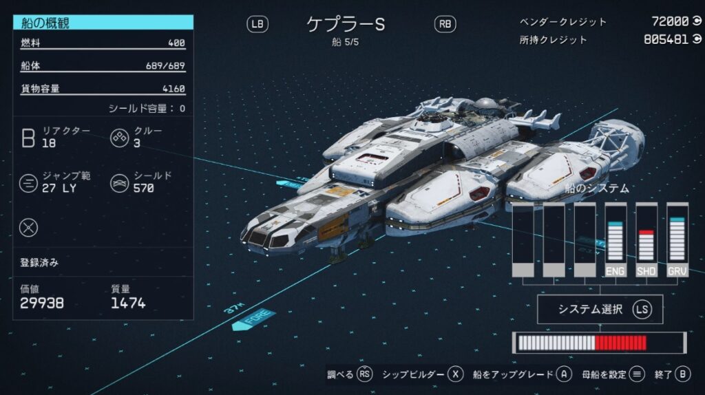 ミッション「複雑すぎる設計」はクリアの報酬としてCランク宇宙船ケプラーRがもらえます。武器はやや貧弱ですが貨物容量が4600程度あり、無料で貰える宇宙船としては十分すぎる性能を有していると思います。