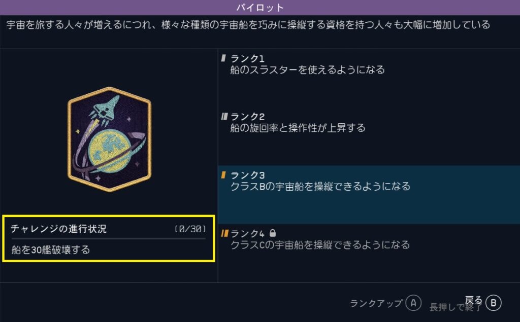 Cランクの宇宙船を操縦するにはパイロットのスキルを最大まで上げる必要があります。ただ、チャレンジの内容が「船を撃破する」となっていて、普通にプレイしていると中々に達成しにくい条件となっています。