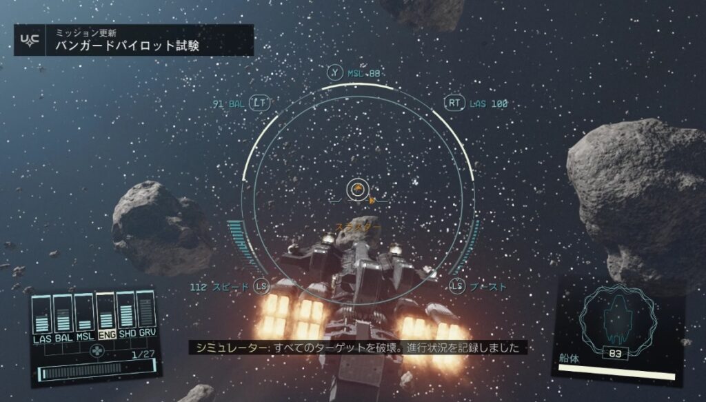 MASTのエレベーターに乗りバンガード・パイロットのシミュレーターのフロアへ行けば、何度もシミュレーターに挑戦ができます。シミュレーターでの撃墜数もスキルのチャレンジに加算されるので、繰り返せば簡単に撃墜数を稼ぐことができます。