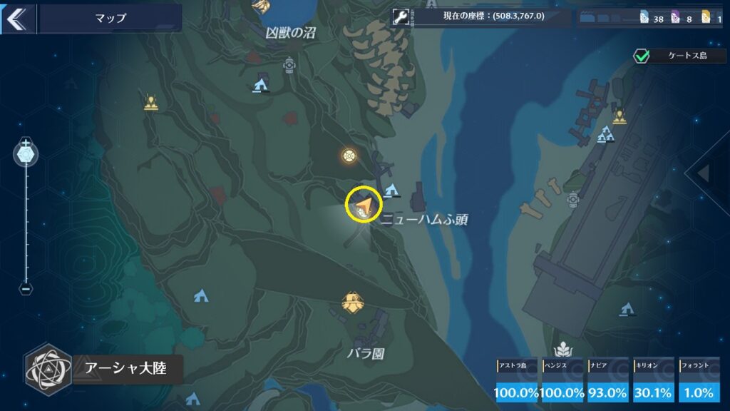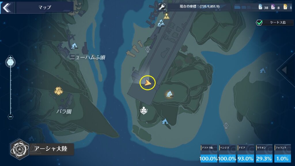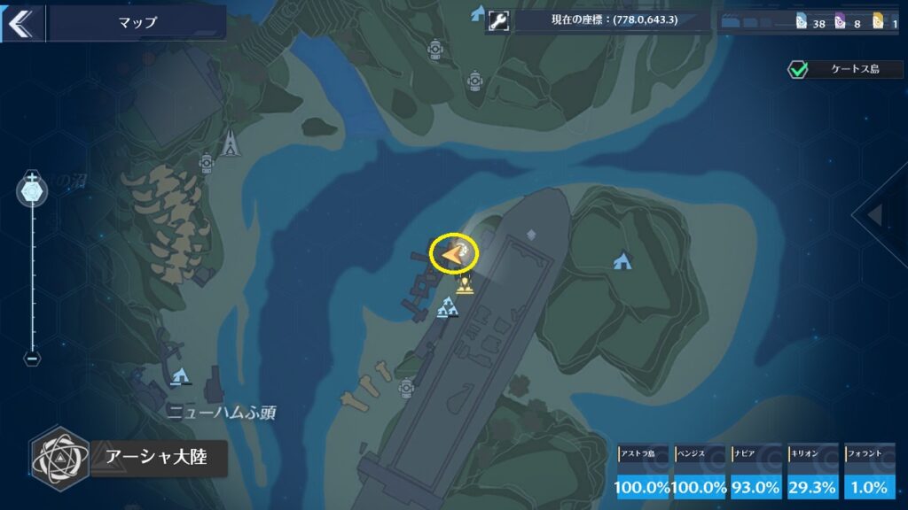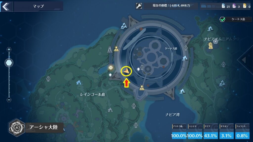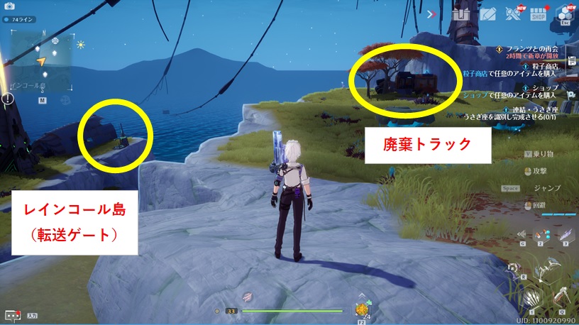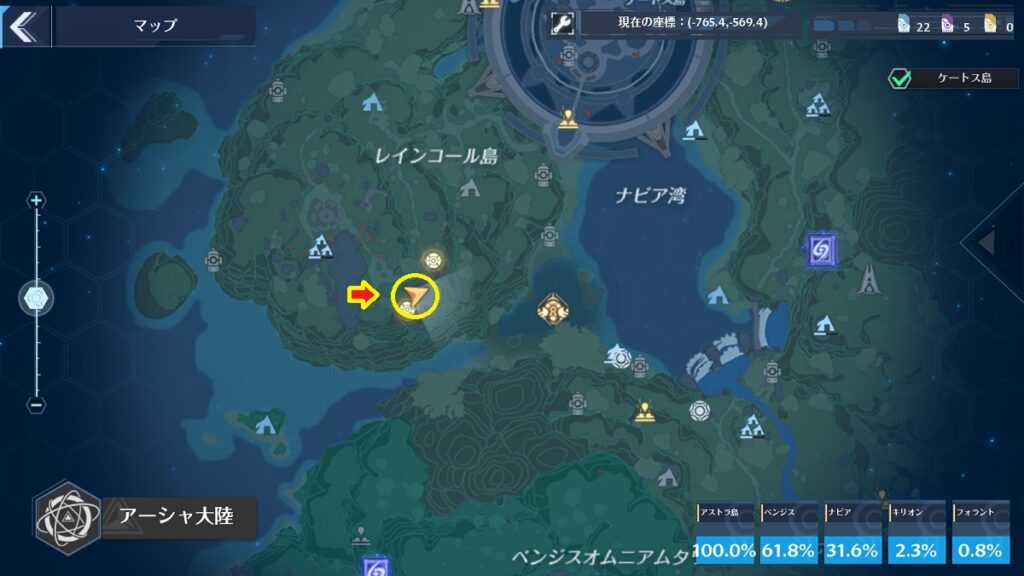 場所はマップ上だとわかりにくいですが、レインコール島[転送ゲート]の近くです。間は崖になっているので迂回して行きましょう。
