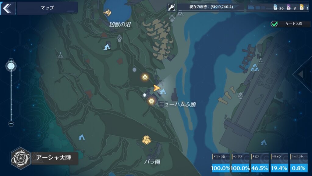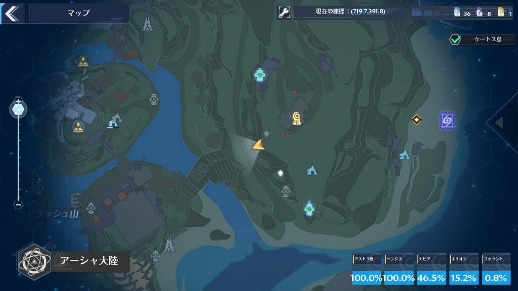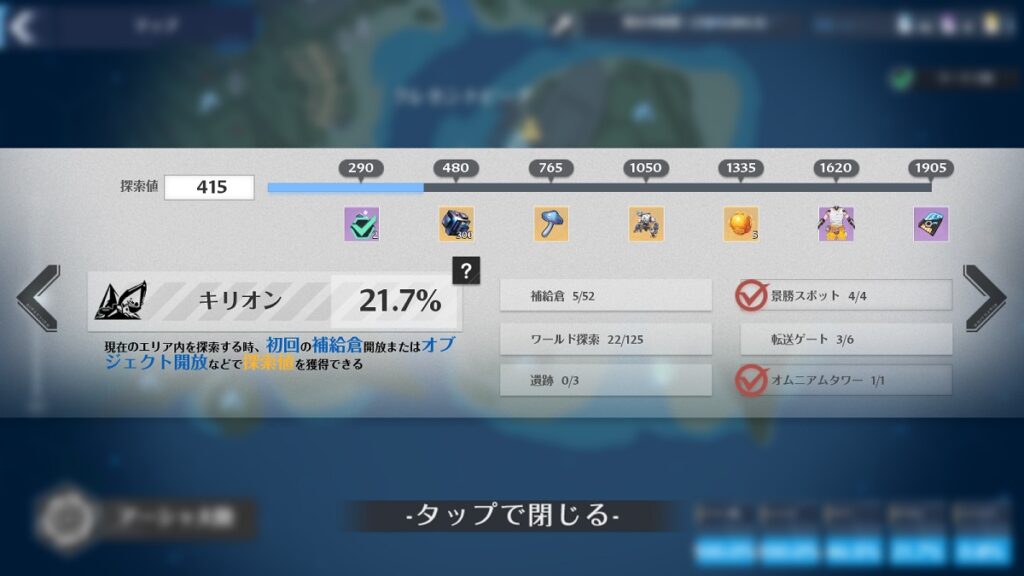 ワールドマップを開いて右下にあるエリア名をタップすると、現在の探索値が表示されます。その中で【景勝スポット】と表示されているのが【風物】です。