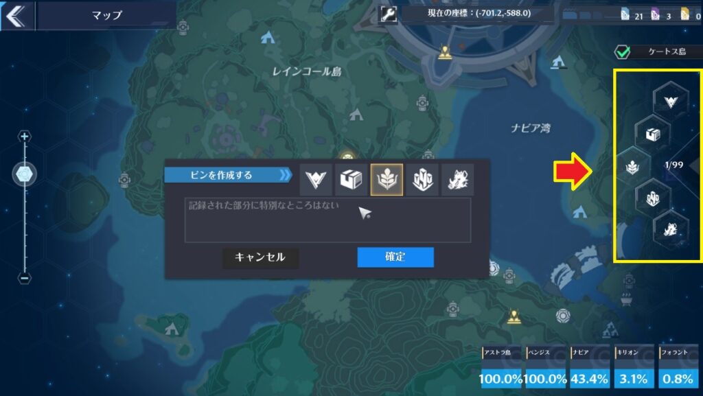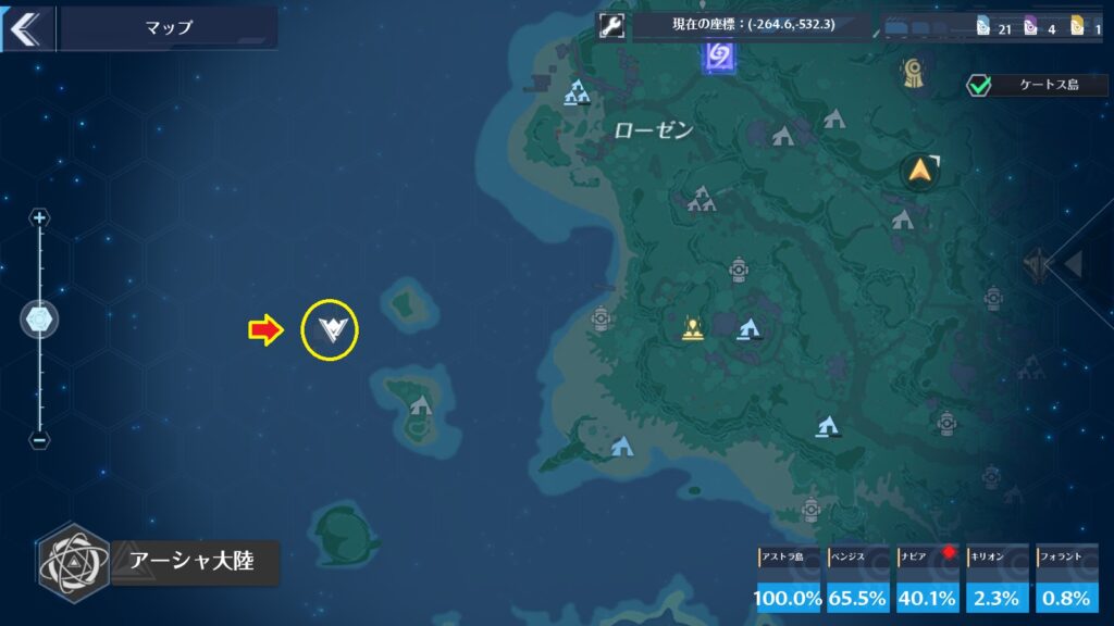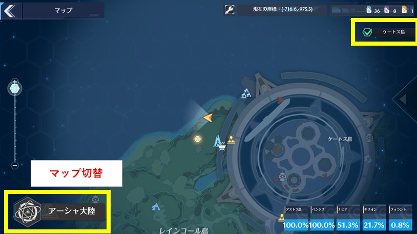右上のチェックボックスを外すとケートス島の表示を消す事もできます。ケートス島が邪魔で下の大陸が確認出来ない場合はここを使ってください。