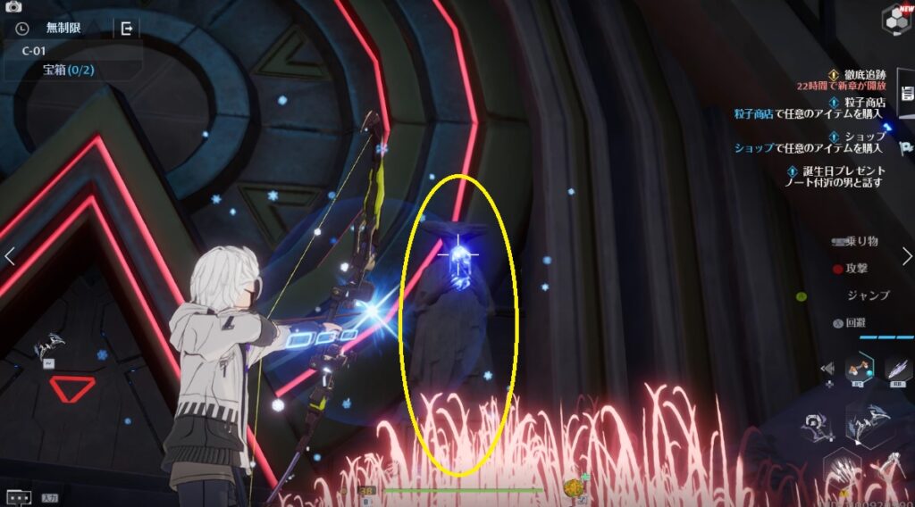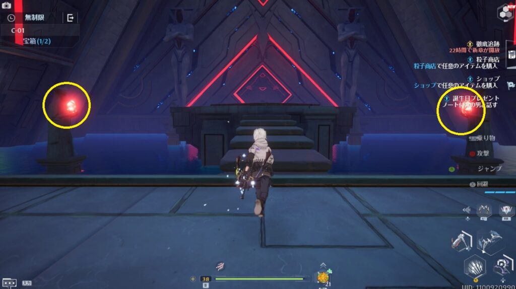C-01は像が持つ宝石の色を変えギミックを解いていく遺跡です。最初に2体の像があるところは、右側の宝石を攻撃し両方を赤色に変えましょう。