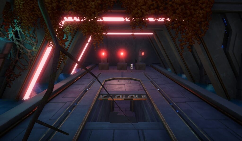 お次は宝石を赤色にすると像が回転を始めます。回転中は奥に見えるジャンプの装置が作動するので、水色のエフェクトが出ているうちにその上に乗ります。すると、自動で空中に浮かび上がるのでそのまま奥へと進みます。