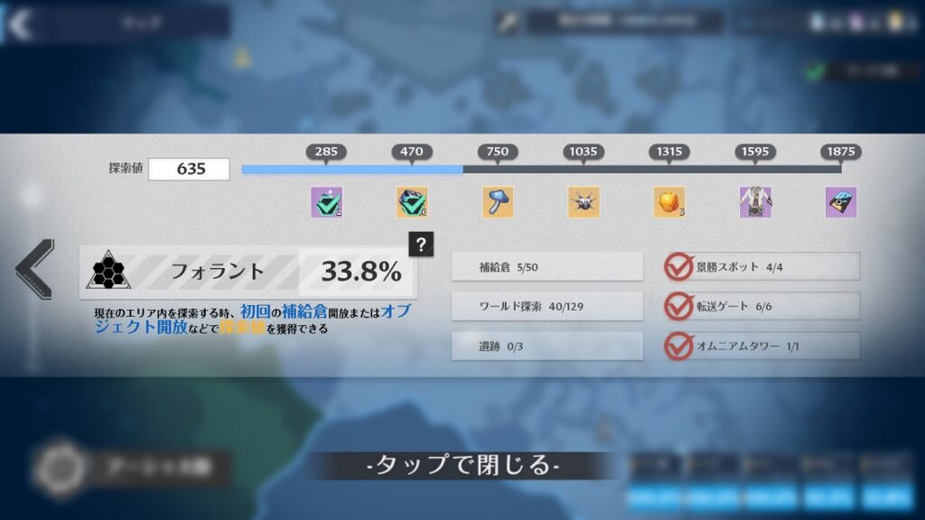 ワールドマップを開いて右下にあるエリア名をタップすると、現在の探索値が表示されます。その中で【景勝スポット】と表示されているのが【風物】です。