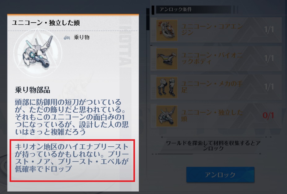 ユニコーン・コアエンジンはキリオンで発生するクエストというかイベントのようなものをクリアしないといけません。こちらは多少手間がかかりますので、別記事にまとめてあります。