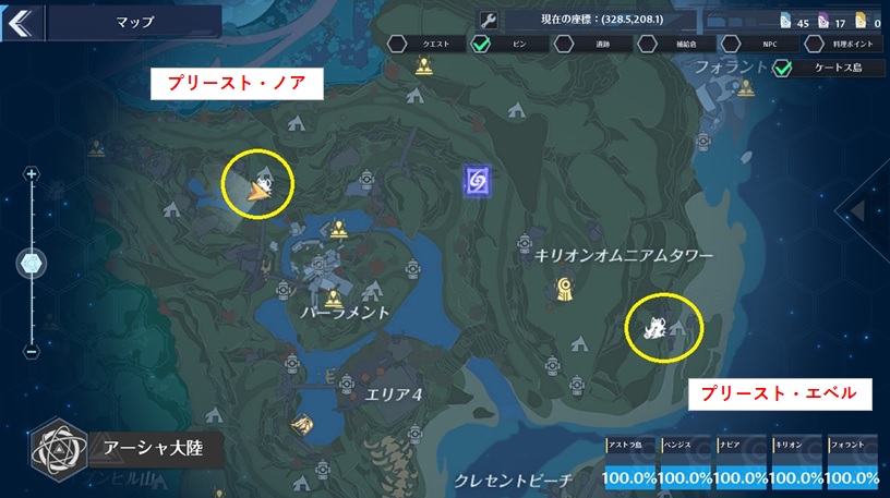 プリースト・ノアとプリースト・エベルの出現位置は上の画像。両者の出現位置は離れていて、交互に狩ろうとして転送ゲートを使おうにも微妙に距離が遠い。移動しながら狩ってもさほど効率は上がらないから、定点で湧き待ちしながら狩る事になると思う。