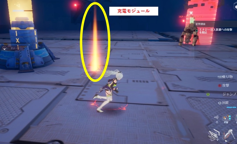 敵が中央にあるチャージタワーを攻撃するので、こちらは敵をなぎ倒しチャージタワーにダメージが入るのを防ぐ。途中で敵が充電モジュール(画像の茶柱)を落とすことがあり、これをチャージタワーに使いエナジー注入するとタワーのHPみたいなゲージが回復する。