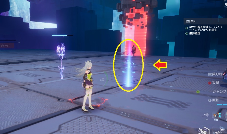 敵を倒していくと数字付きの水色の柱が出現します(拾ったりはできません)。出現する敵を倒していくと、最終的に3つの数字が出現するので敵を全て倒したら中央の装置でパスワードを入力する。