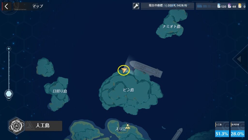 人工島マップの南にある座礁船の残骸の上にあります。
