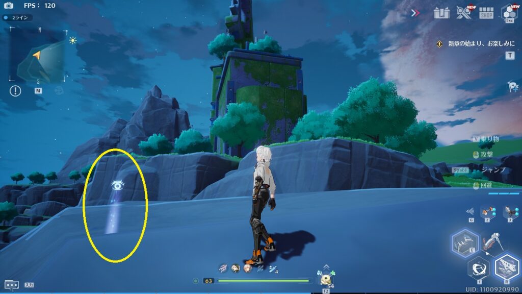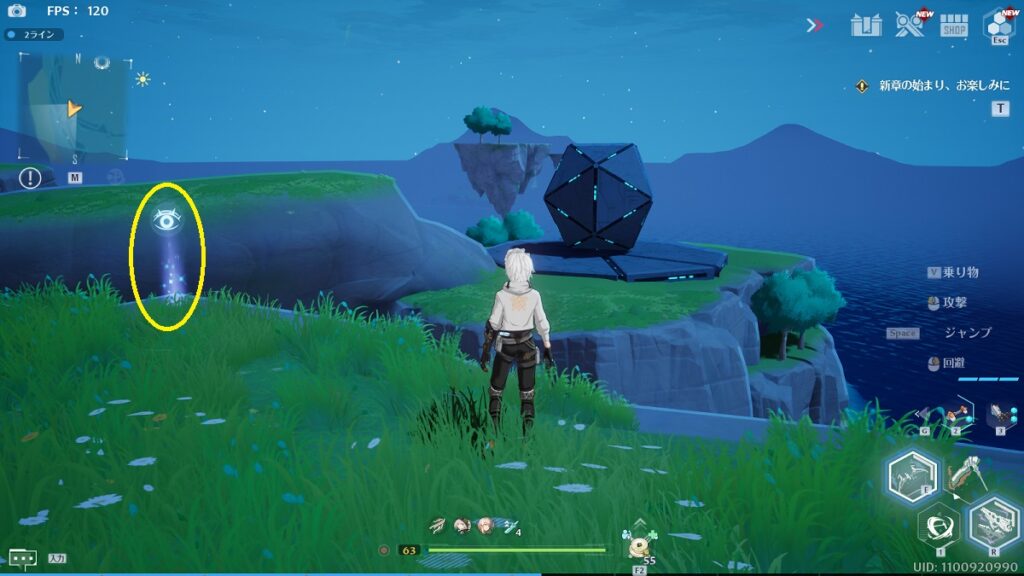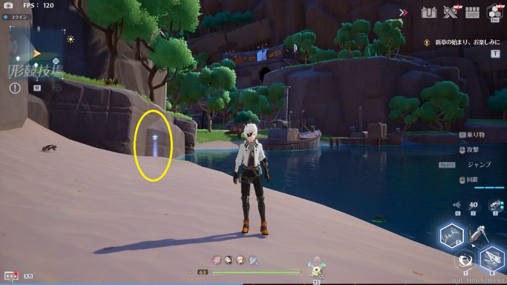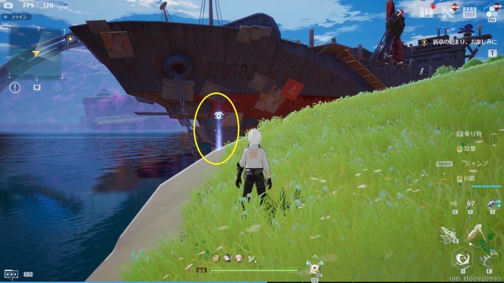 ゲーム内の画像とアングルが逆なので戸惑いますが、船の近くの崖の上です。