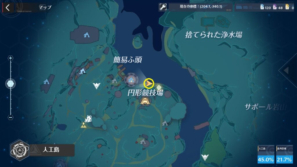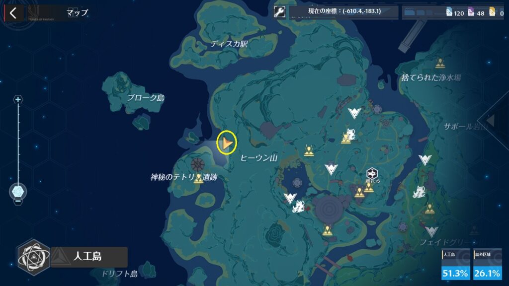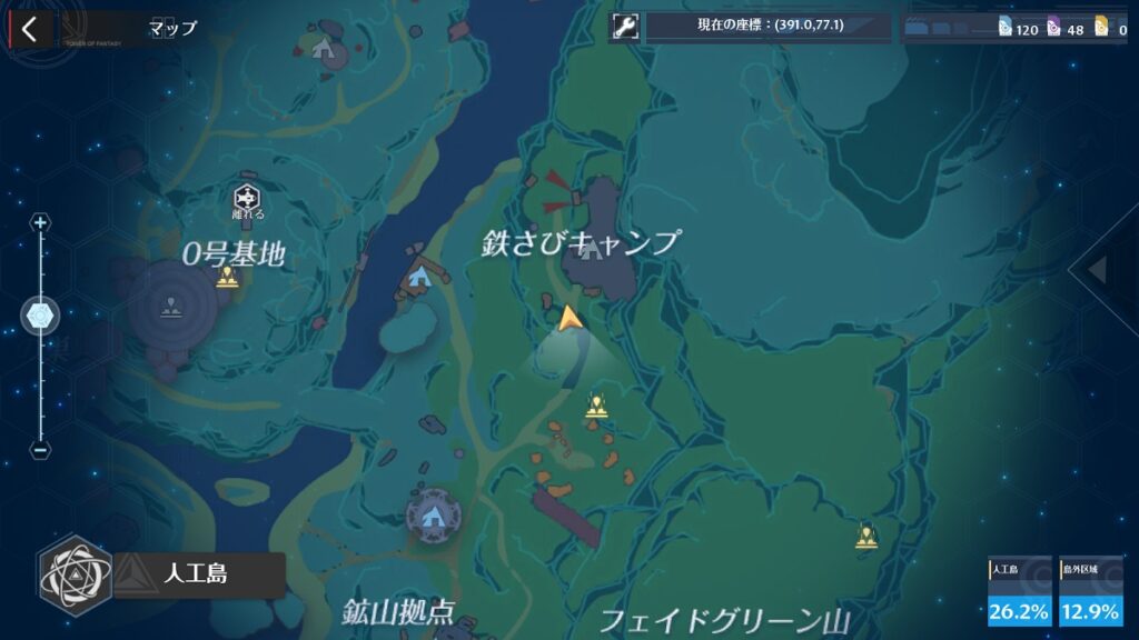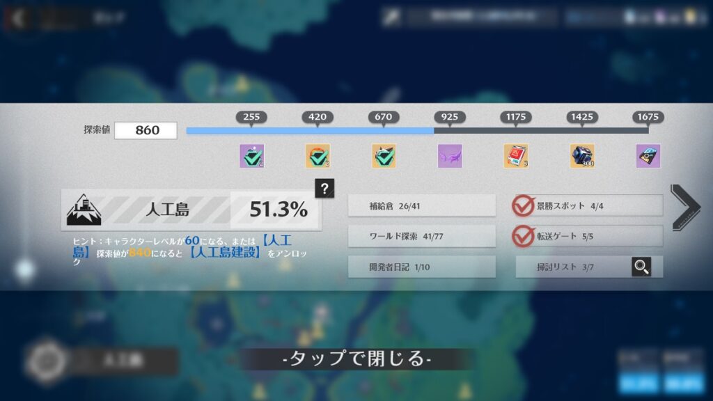 ver1.5で実装された人工島ではワールド探索の探索値が「人工島」と「島外区域」で分かれています。風物は「人工島」「島外区域」ともに4か所ずつの合計8か所となります。