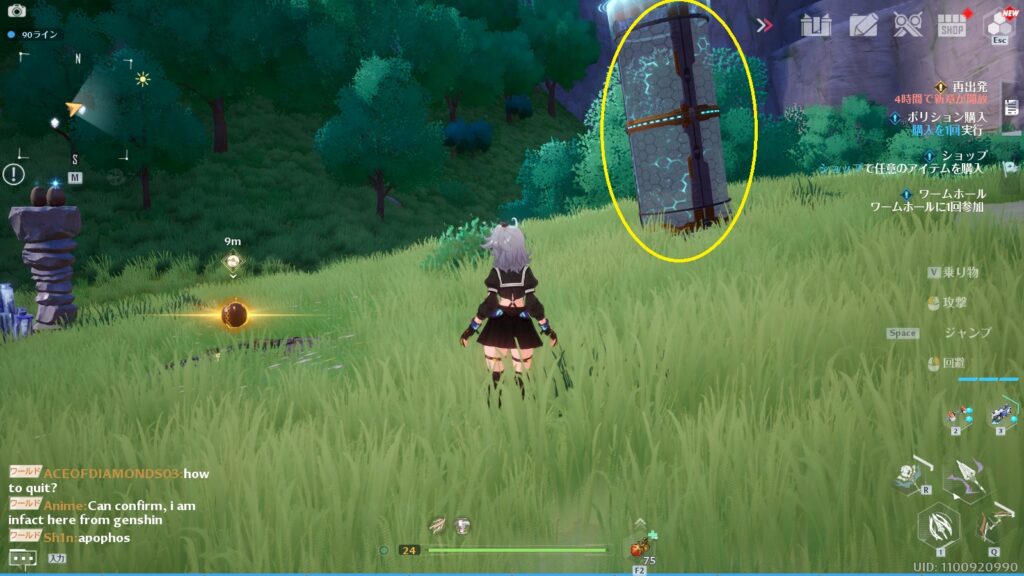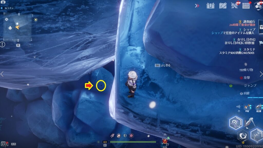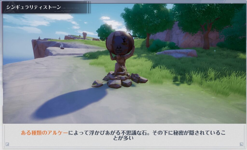 シンギュラリティキューブ(アルケー)を使って上の丸い石を吹き飛ばす。シンギュラリティキューブ(アルケー)は遺跡A-02で手に入る。
