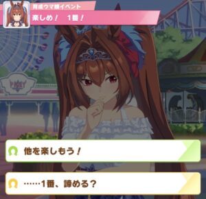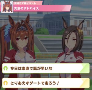 オークスもしくはダービーに出走するか選択になる。体感的にオークスの方が難易度が低い印象だが、ファン獲得数がダービーに比べて少ないのでファン数を稼ぎたい場合はダービーを選ぶとよさそう。