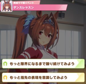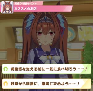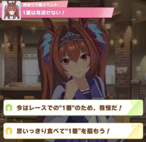 他のウマ娘でも出現する新年の会話選択肢。上(ステータス)、真ん中(体力回復)、下(スキルポイント)と覚えておくとよい。スキルポイントを取る人が多そうだけど、現状のステータスなどを見て足りないところを補うといいと思う。