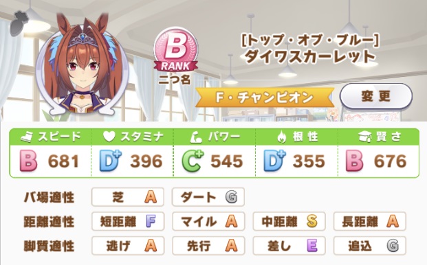 現在、ダイワスカーレットは先行場として育成しています。初期だと長距離の適正がBなので、最初に長距離Aにするように継承馬を選んでおくと安心。基本はスピード・パワー・賢さを中心にステータスを上げていくイメージ。賢さは夏合宿や体力調整で選んでいくとそれなりに上がっていくので、普段はスピードかパワーに振っていくとよい。