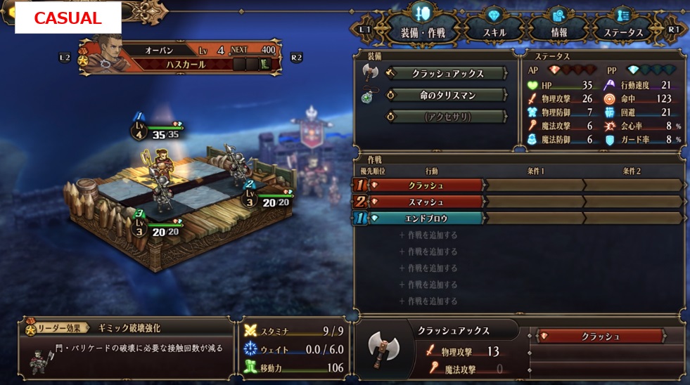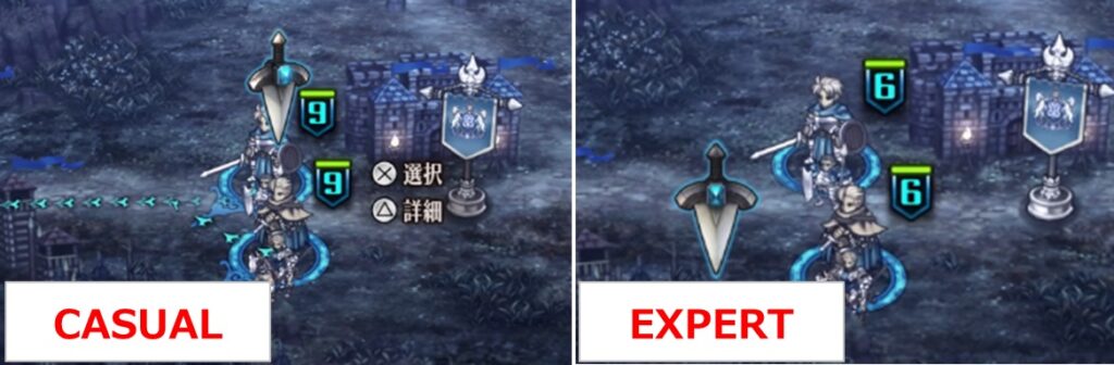 まずは出撃時のスタミナの初期値が異なります。おそらくスタミナの上限値だと思いますが、CASUALだと9なのに対しEXPERTでは6しかありません…。