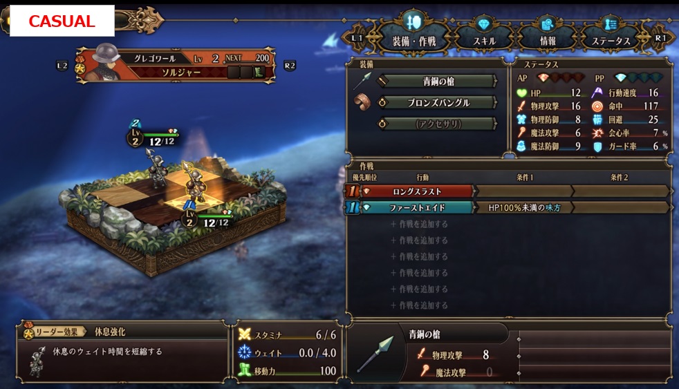 スタミナの管理が結構な足枷になっている気がしたので、サクサク進めたい人はCASUALがいいかもしれないね(TACTICALとEXPERTはスタミナ一緒なので…)。まあ、難易度はいつでも変更可能だしいろいろ試すのもありだね。