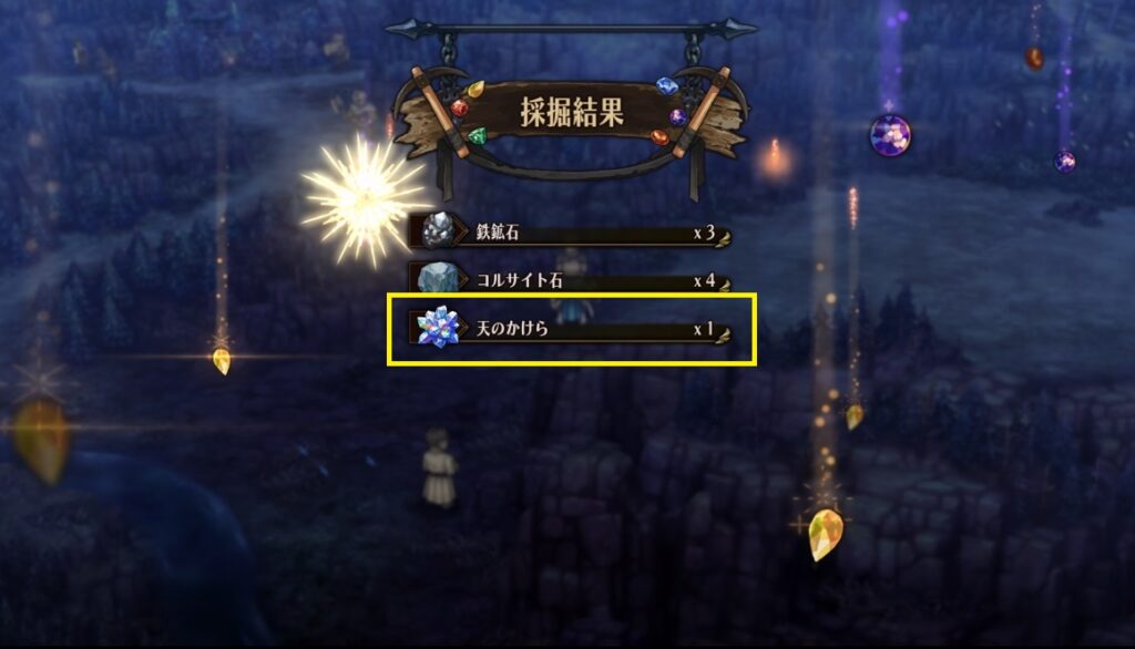 毎回手に入るほどの出現率ではないですがそれなりに回収はできるので、天のかけらを集めたい人は採掘場で採掘を繰り返すといいです。