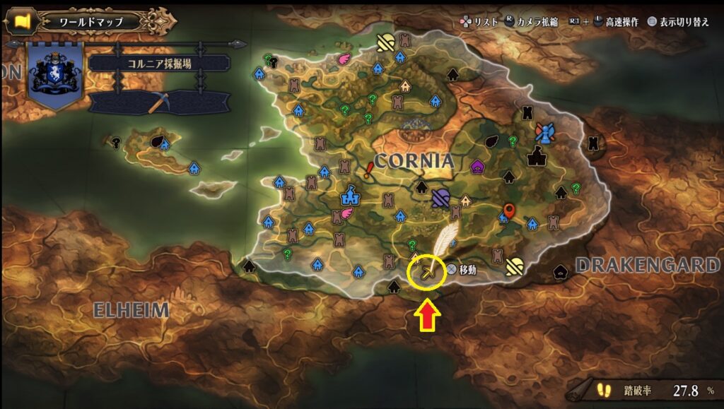 コルニアの採掘場はコルニアの南の方です。ゲーム開始から数時間で到達できると思います。