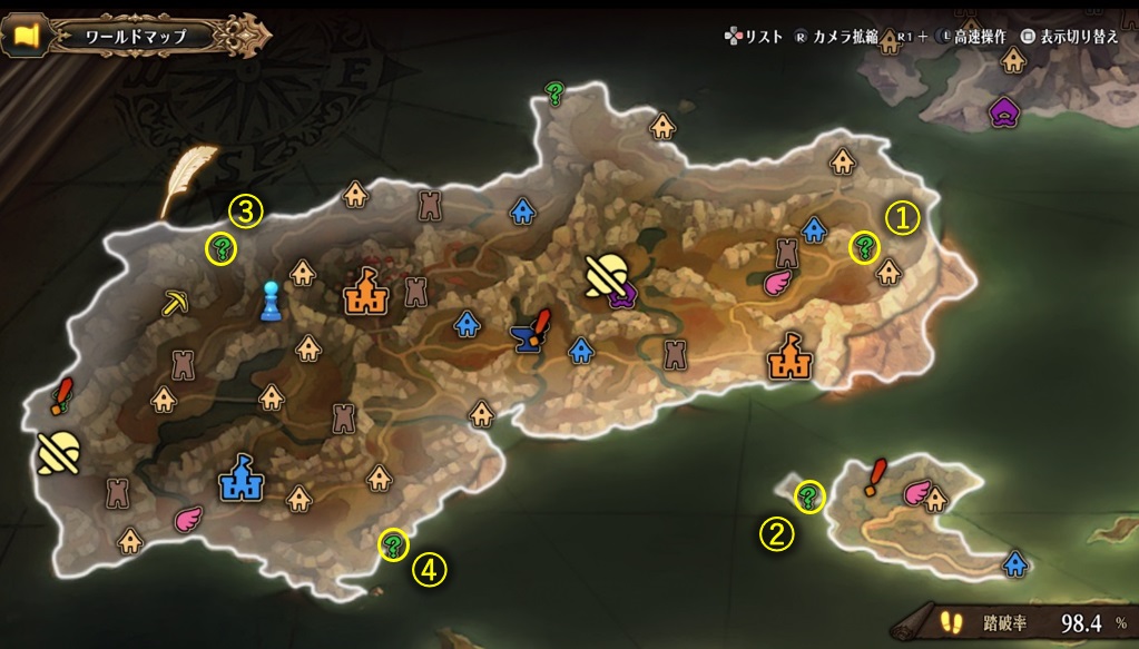 ①~④の順で巡っていくと最終的に王杖アルビオールが入手できます。②の海馬の石版がある島へは港町シトロンプールから船に乗れば行く事ができます。残りの石版は近くの町や砦へファストトラベルすれば難なくいけるかと思います。