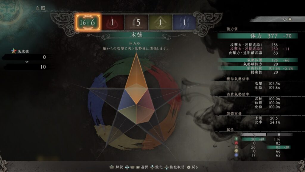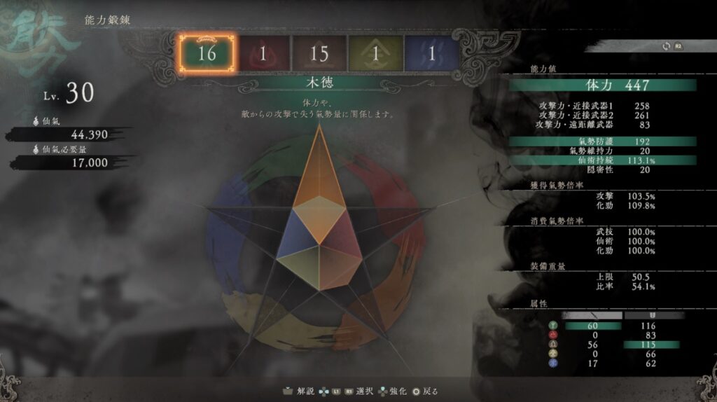 ステータス(能力値)というのはキャラのレベルみたいなもの。ウォーロンでは「木徳」「火徳」「土徳」「金徳」「水徳」の5種類に好きなように割り振ることができる。