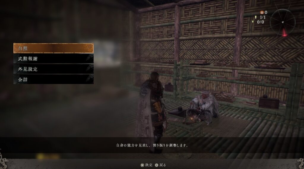 【自照】がステータス(能力値)の振りなおしです。試しにやってみましたが、特にアイテムやお金は必要がなく自由にできる感じでした。装備やビルドを試すのにノーリスクなのでいろいろと考えるのが捗りそうです。