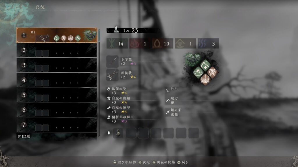 軍旗のところで「戦仕度」→「兵装」と選ぶと、各ステータス(能力値)のレベルや装備、仙術などはセットで保存ができるようになっています。これ無茶苦茶便利なので使ってない人は是非活用してみてください。