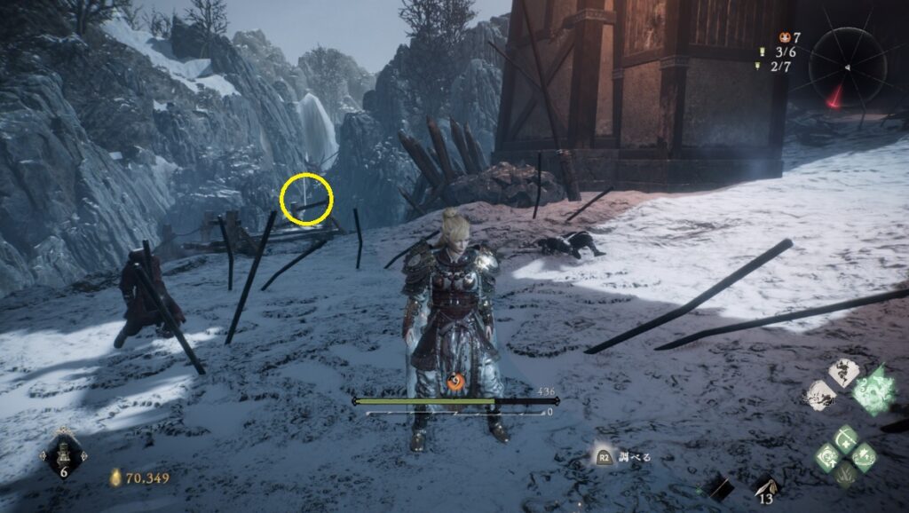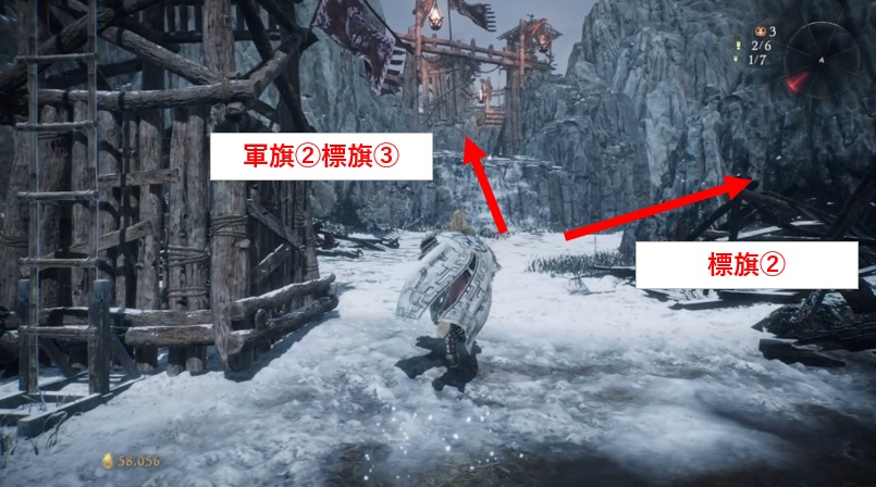 先ほど制圧した拠点前の壁を登り奥へ進むと標旗③