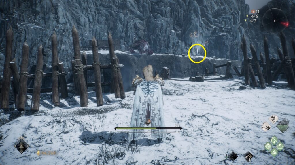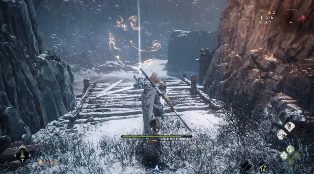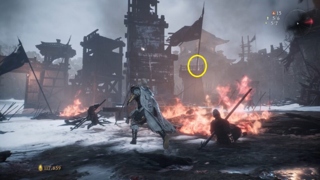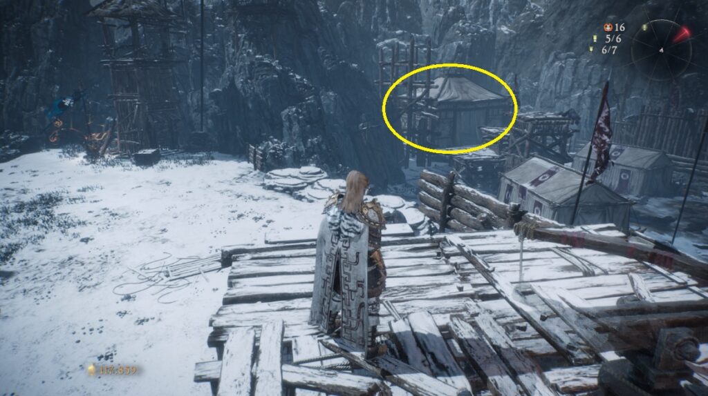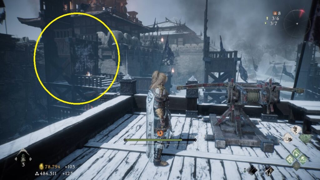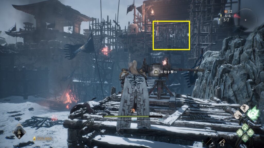 右側から行く場合は設置されている床弩で木の板を破壊すると進める。どちら側から登っても全部の場所にいけるし時間に差がないのでお好きな方法で。