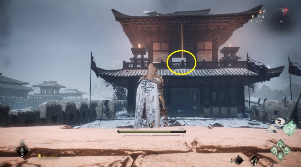 孫堅と孫策がいた軍旗の場所から橋を渡り左側へ進んだ場所。壊れた橋をジャンプで飛び越えた先に標旗があります。
