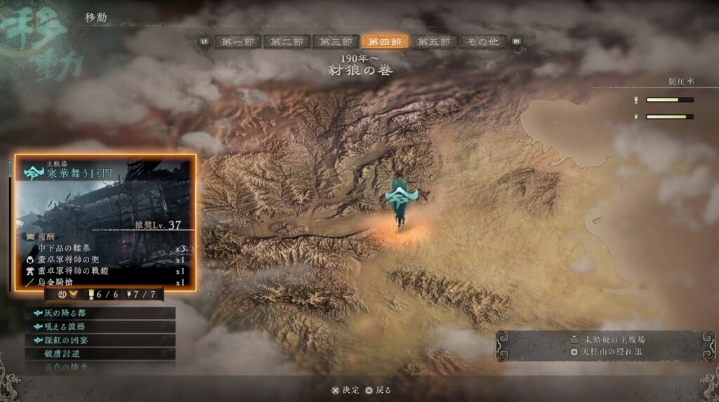 本作で意外と重要なのが軍旗・標旗を立てることなんですが、だんだんとステージマップが入り組んできて見つからないってこともあるかと思います。ここでは第四節「寒華舞う巨門」の軍旗・標旗の場所をまとめてみました。