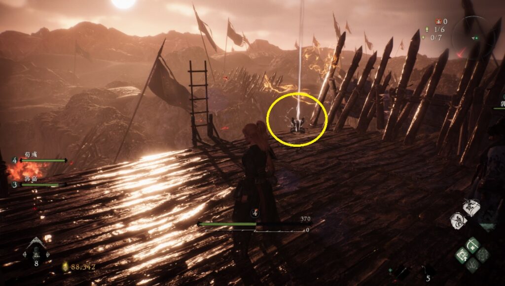 今度は標旗④があった建物の上を通過し先に進む。猿がいる場所で画像の位置を登ると建物の中に標旗。術士もいる。