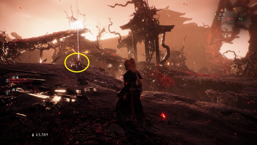 軍旗②付近の水鬼がいるあたりの木の根から上に登って行ける。少し進むと画像のような建物があるので横から下に降りて家の中に入る。家の中に標旗。