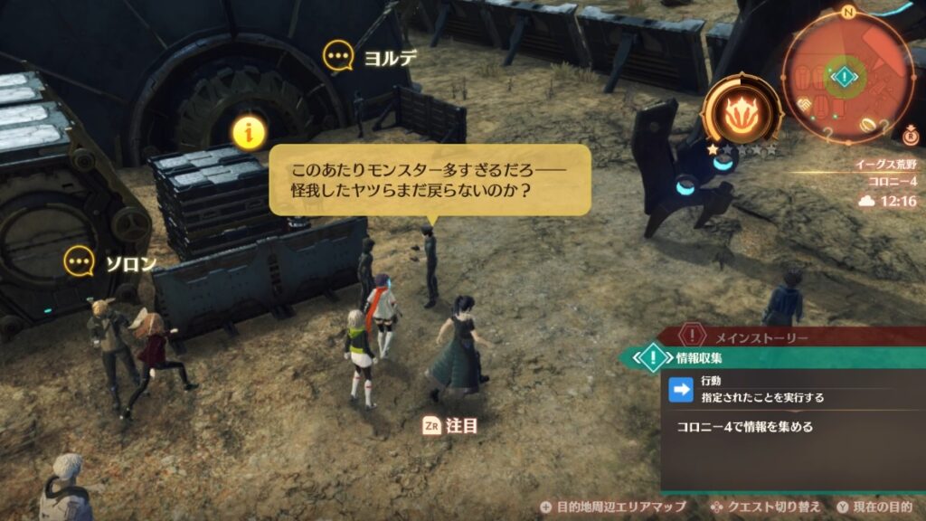 情報を得られるキャラクターには黄色の!が表示され、近くにいくと会話を聞くことができます。