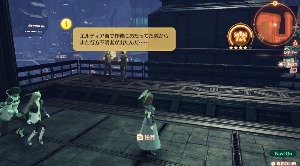 情報を得られるキャラクターには黄色の!が表示され、近くにいくと会話を聞くことができます。