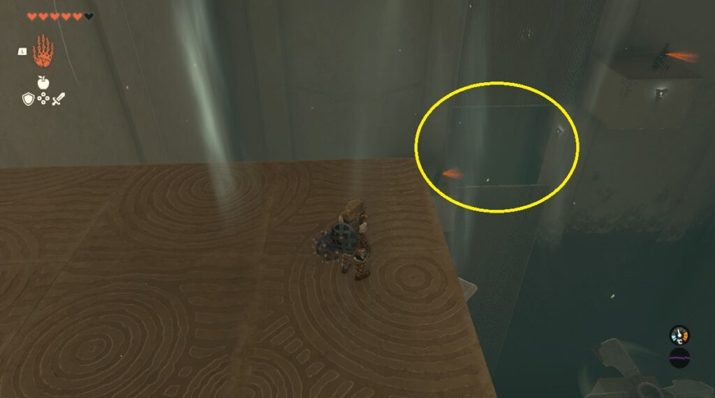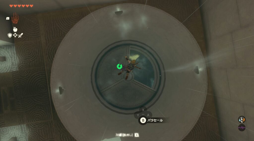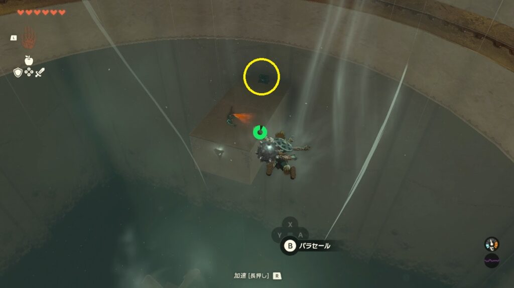 宝箱があった位置から壁の間のルートを目指して飛ぶ。壁を抜けた後はパラセールにして浮上する。