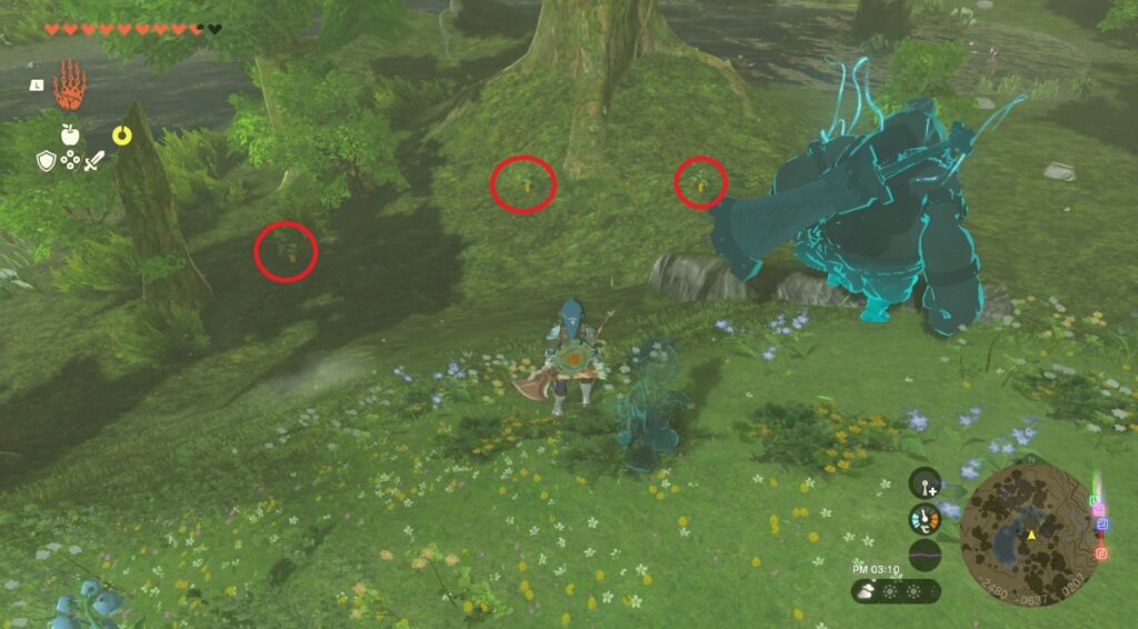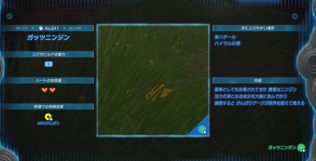 ただ、マップ的に他の草花と一緒になって見えにくいのが難点ですかね…。ウルトラハンドでカメラをぐるぐる回すと素材系も光って見えやすくなるので、現地にいったらやってみるのも一つの手です。