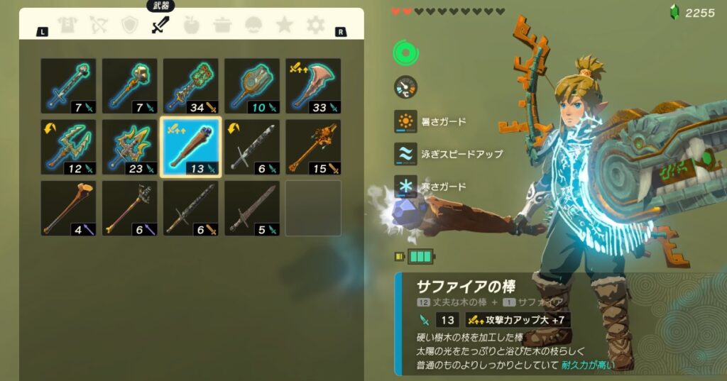 スクラビルドでサファイアを付けたものは「暑さガードLV1」が発動しています。画面の耐性には表示されないですが、実際に暑い場所にいくと効果が発動しているのがわかります。