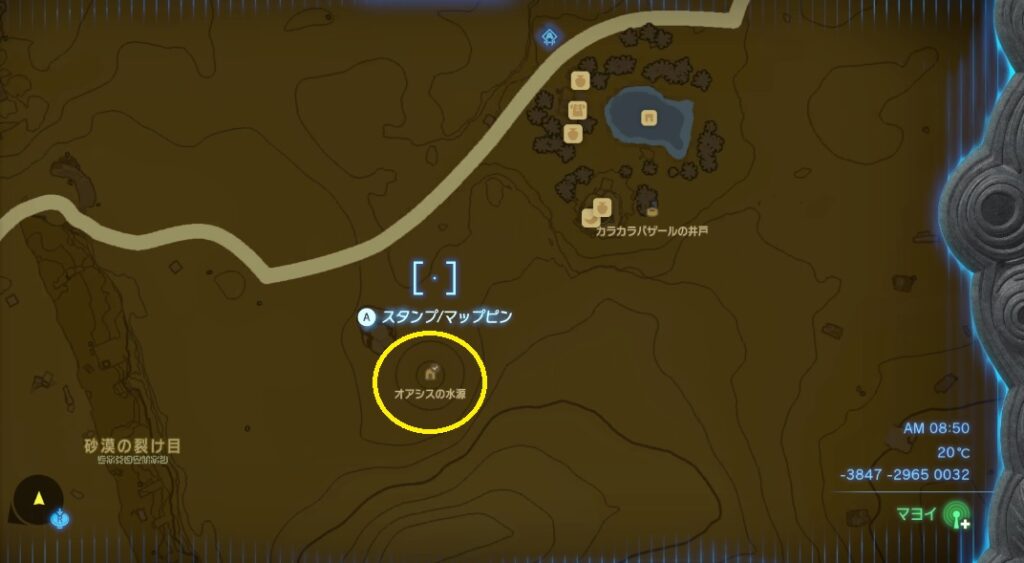 カラカラバザールと砂漠の裂け目の中間くらいにあるオアシスの水源へ行く。マップの場所にいくと流砂があるのでそこへ飛び込むとオアシスの水源で、中にボトスがいるので話しかける。