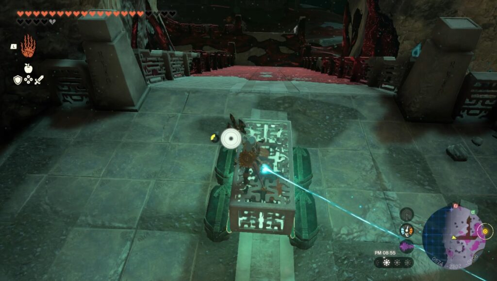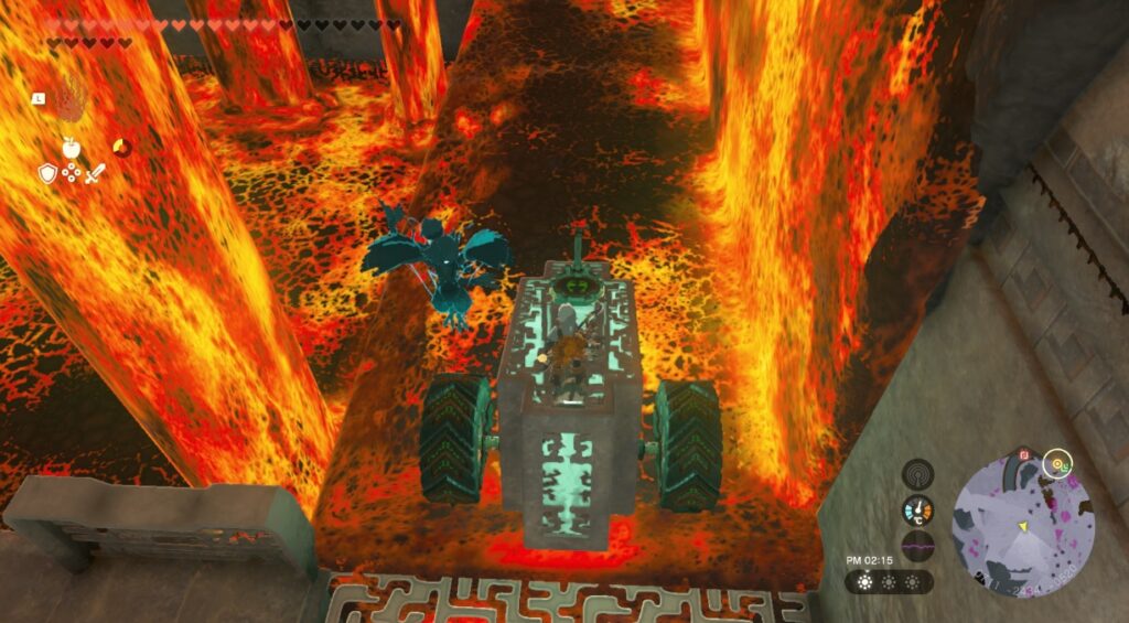 箱にタイヤと操縦桿を付けて車を作成しマグマの上を進む。