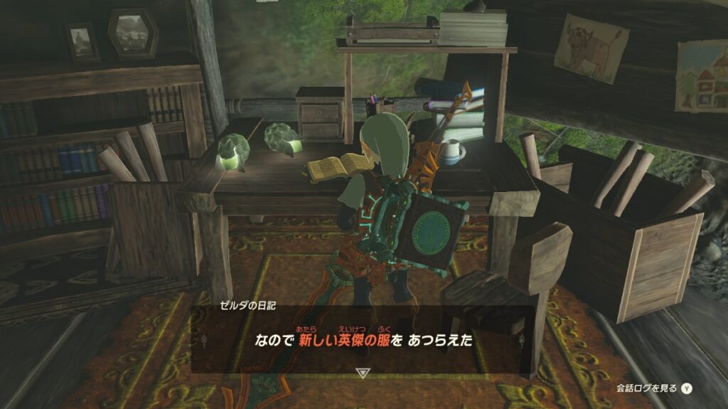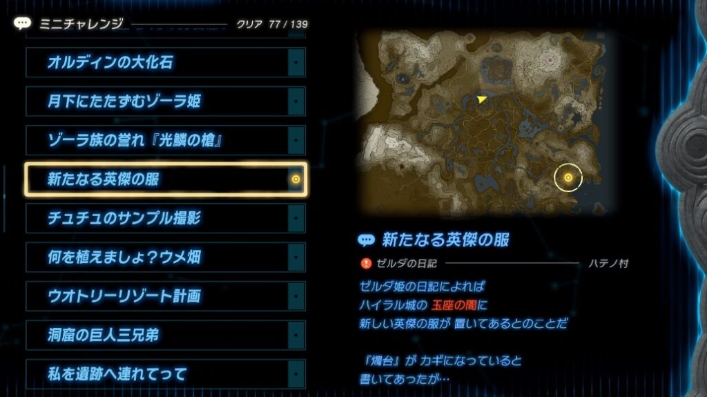英傑の服のヒントはハテノ村のゼルダの部屋で見つける事ができます。メモを調べるとミニチャレンジ「新たなる英傑の服」が発生するので、ストーリーを楽しむには先にハテノ村によっておくのがいいですね。